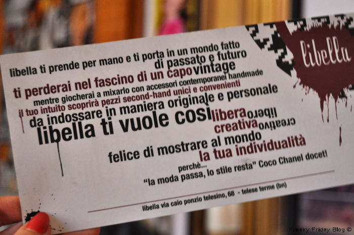 Buongiorno e buon lunedì a tutti. Da qualche ora sono tornata in capitale e non vedevo l’ora di mostrarvi questo nuovo post riguardante il vintage. Se un po’ mi avete seguita in questi mesi, saprete che il vintage è la mia passione! L’idea di poter riutilizzare, e ridare vita ad oggetti usati in passato e reinterpretarli mi affascina. Ho approfittato di questo fine settimana a casa, a Telese, per andare all’inaugurazione di un negozio vintage: “libella“. Inutile dirvi che mi sono innamorata di molti capi, in modo particolare delle borse. Purtroppo la borsa che avevo scelto è stata venduta l’attimo dopo, ma spero comunque di riuscire a prendere una delle splendide maxi o mini bag. Riuscite ad indovinare quali sono i miei capi preferiti tra queste foto?