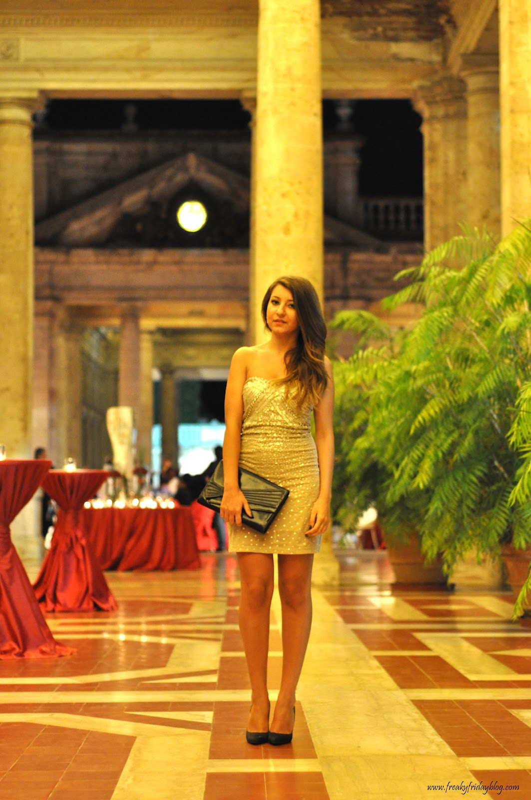 Per la serata io ho optato per un mini dress di perline e paillettes dorato di Silvian Heach con accessori neri, make-up oro e orecchini luminosi al lobo.